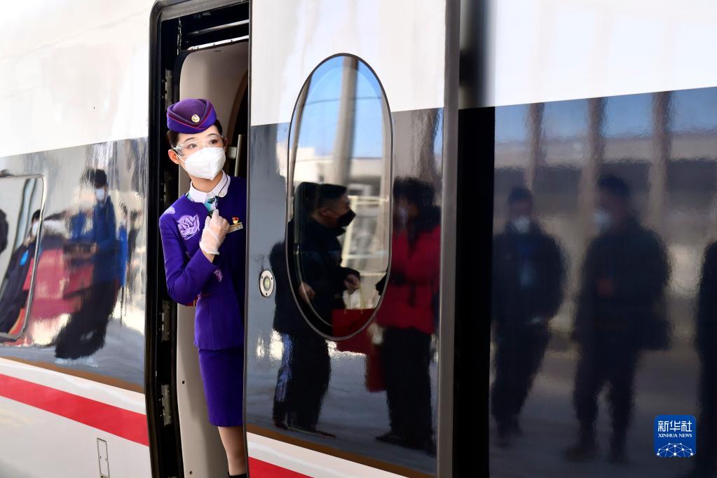 12月30日,在濟(南)萊(蕪)高鐵雪野站,乘務人員在車門處作業。
