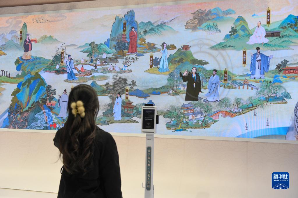12月29日,在第十八屆文博會浙江展臺的數字文化互動長卷前,參觀者“入畫”與歷史人物互動。