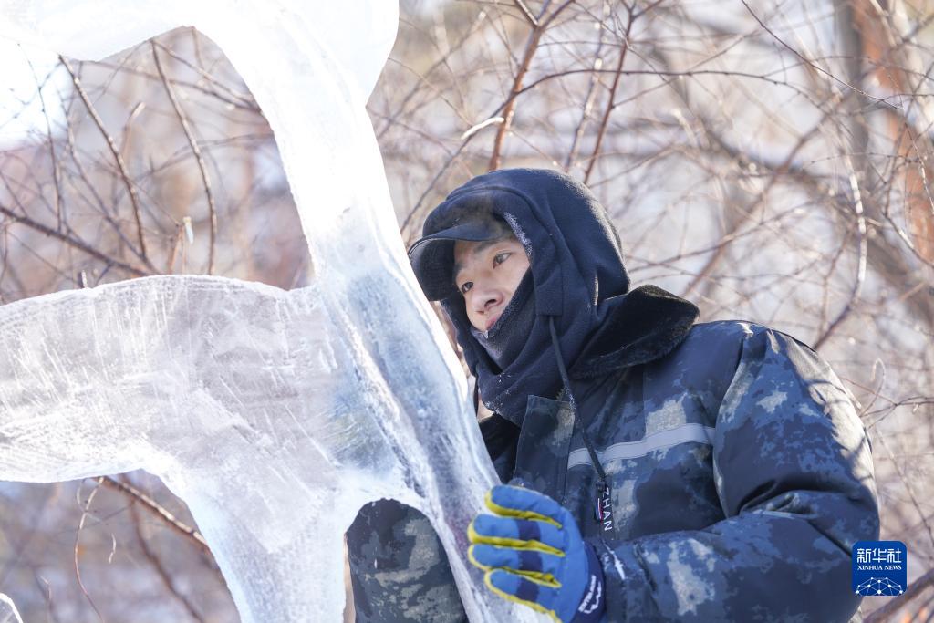 當日,在黑龍江省哈爾濱市,參加第17屆全國大學生冰雕藝術設計創作大賽的冰雕選手在嚴寒中進行藝術創作。