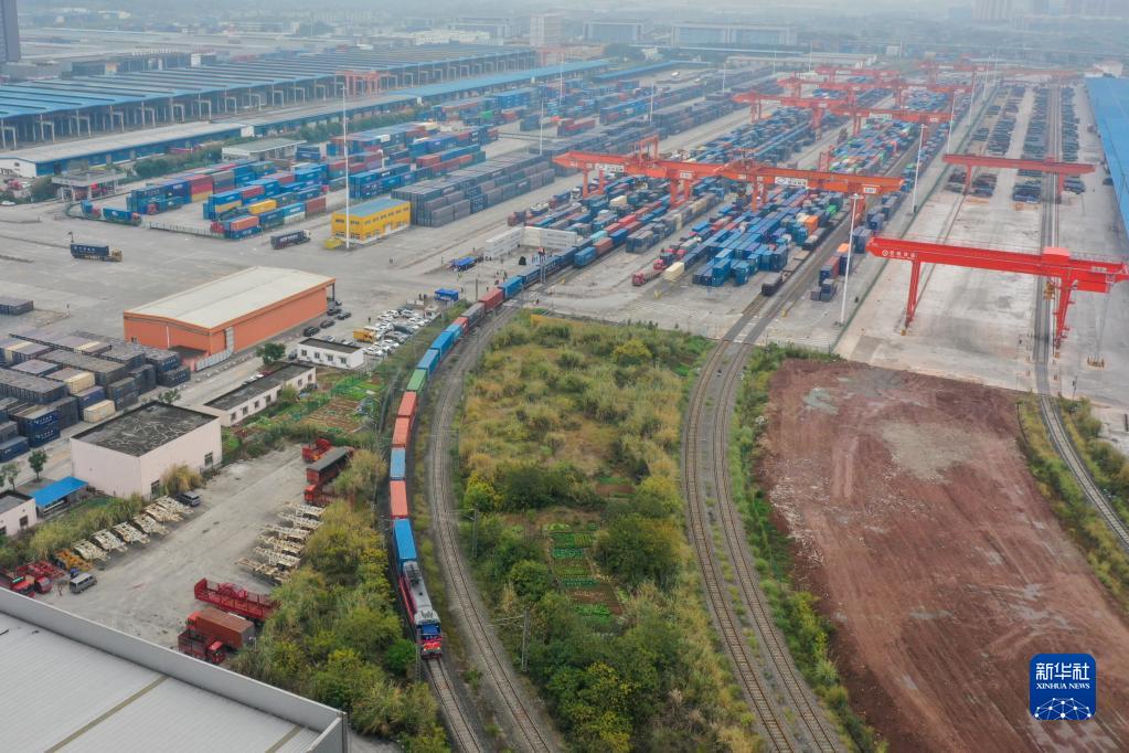 12月30日,西部陸海新通道鐵海聯(lián)運班列在重慶團結(jié)村中心站順利發(fā)車(無人機照片)。