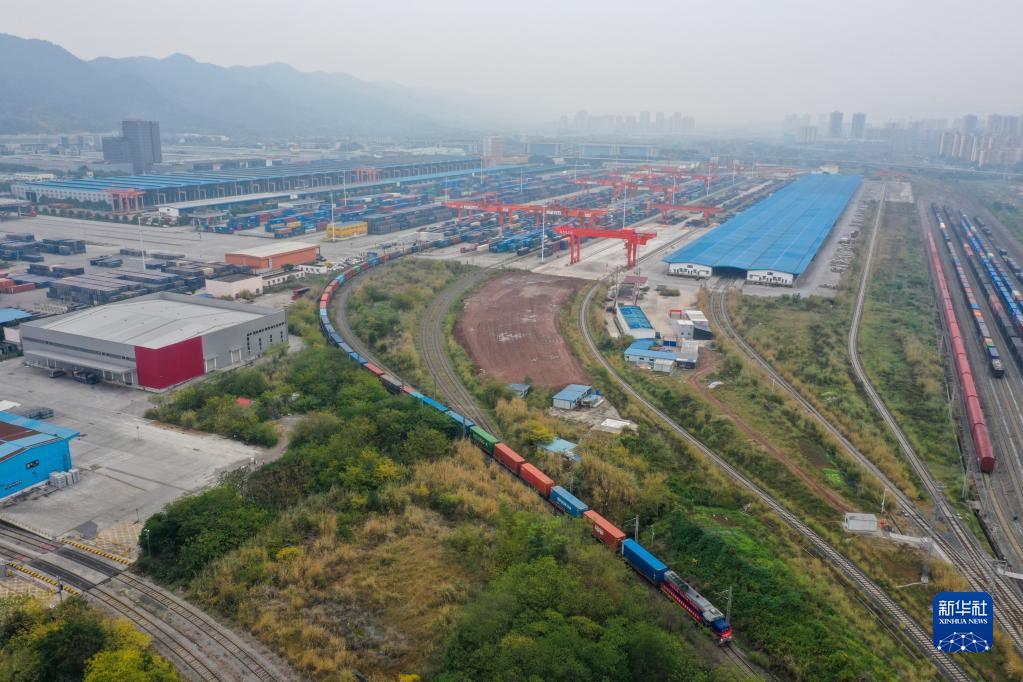 12月30日,西部陸海新通道鐵海聯運班列在重慶團結村中心站順利發車(無人機照片)。