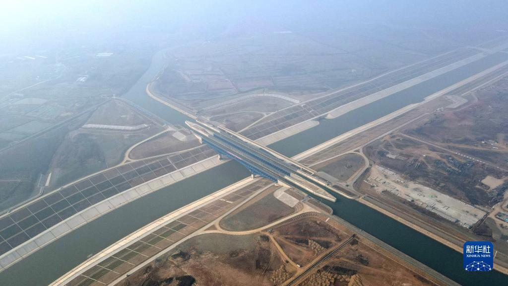 12月30日,中鐵四局參建的引江濟淮淠河總干渠渡槽通航(無人機照片)。淠河總干渠從引江濟淮運河上凌空而過,呈現出河上有河的“水上立交”景象。