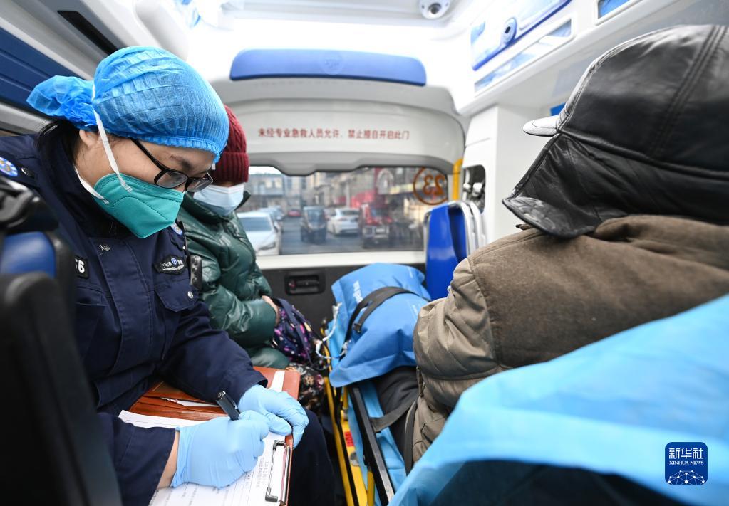 在天津市急救中心一輛急救車上,急救醫生謝艷杰在詢問和記錄病人信息(12月29日攝)。新華社記者 趙子碩 攝