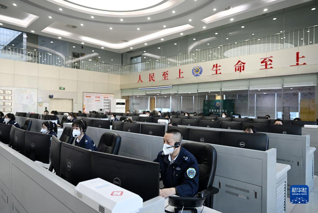 在天津市急救中心通訊調度大廳內,調度員在緊張工作(12月29日攝)。新華社記者 趙子碩 攝