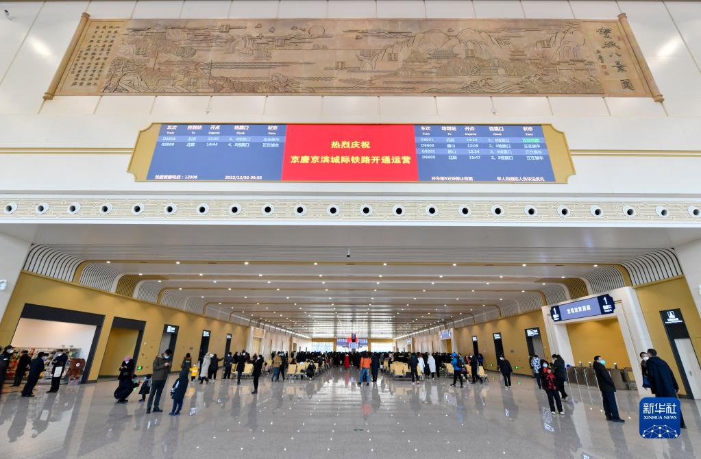 12月30日拍攝的寶坻站內一景,上部為體現寶坻特色的“寶坻八景圖”浮雕。新華社記者 孫凡越 攝