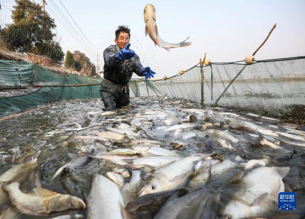 12月30日,江蘇淮安市淮安區流均鎮養殖戶在魚塘冬捕。新年臨近,江蘇淮安市淮安區流均鎮養殖戶進入冬捕忙碌時節,呈現出一派人歡魚躍的豐收景象。新華社發(趙啟瑞 攝)