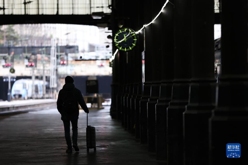 12月23日,一名旅客走過法國巴黎圣拉扎爾火車站的月臺。