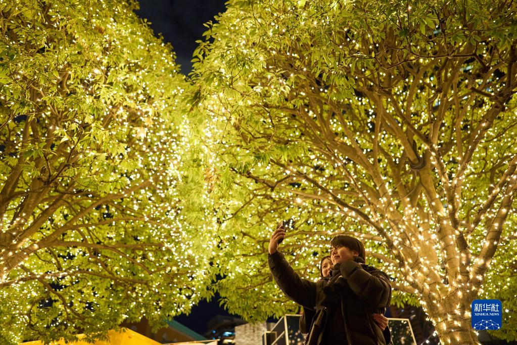 12月25日,游客在日本東京惠比壽花園點亮燈光的樹下合影留念。