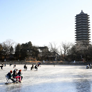 12月31日,人們在北京大學未名湖冰場上玩冰車。