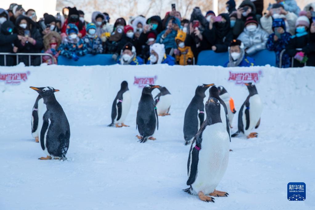 12月31日,哈爾濱極地公園的企鵝在戶外巡游。
