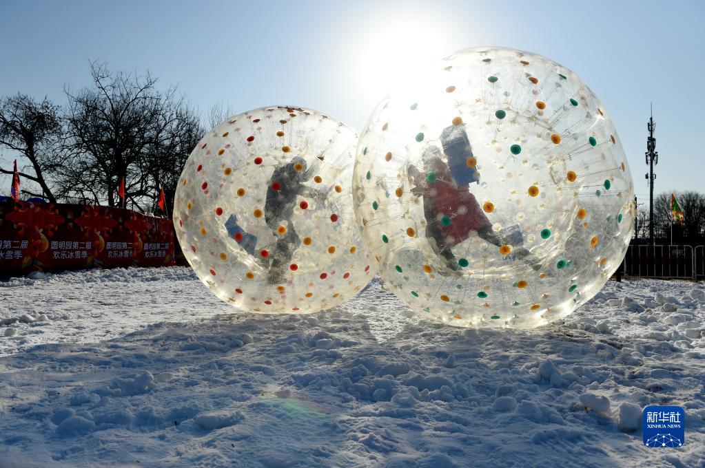 12月31日,游客在圓明園雪場體驗雪地悠波球。