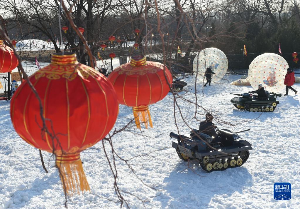 12月31日,游客在圓明園雪場玩“雪地坦克”。