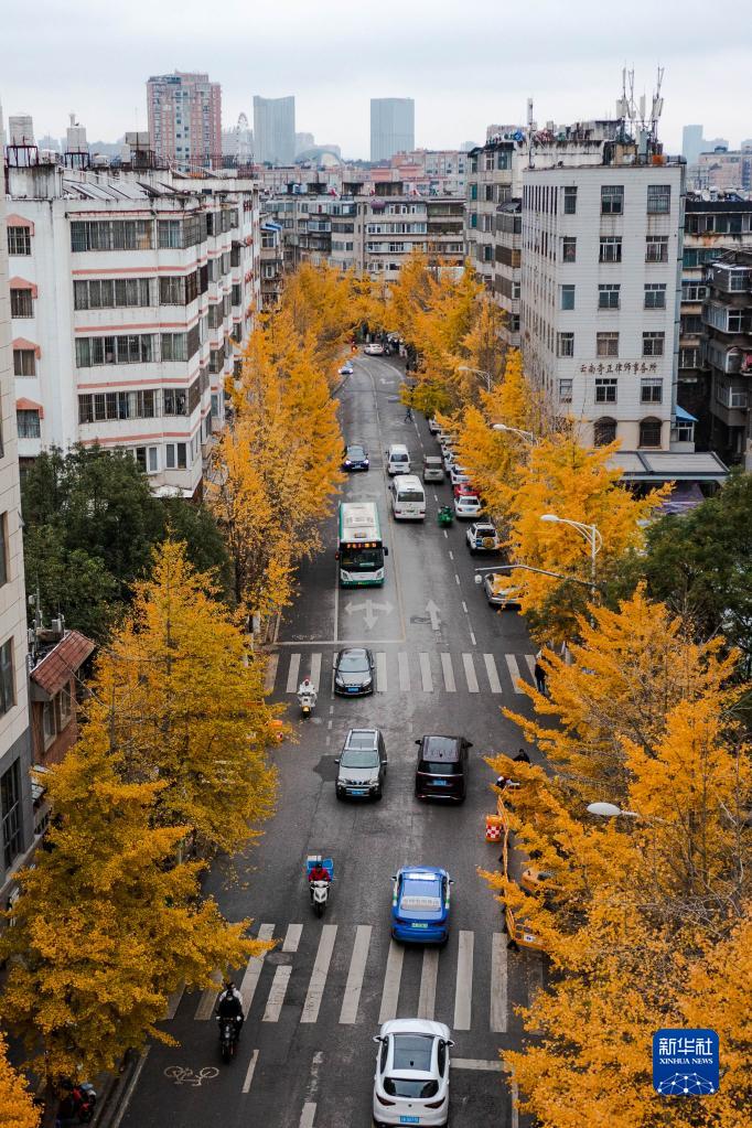近日,云南省昆明市文林街街道兩側的銀杏進入最佳觀賞期,金黃色的樹葉掛滿枝頭,吸引游客前來觀賞。