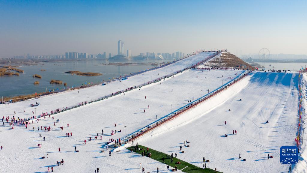 12月31日,市民在寧夏銀川市閱海滑雪場體驗冰雪項目(無人機照片)。