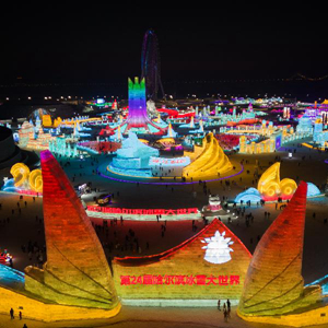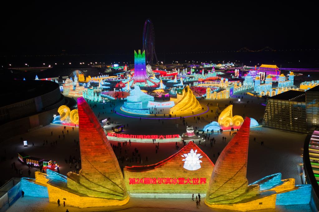 12月31日,游客在哈爾濱冰雪大世界園區游覽(無人機照片)。