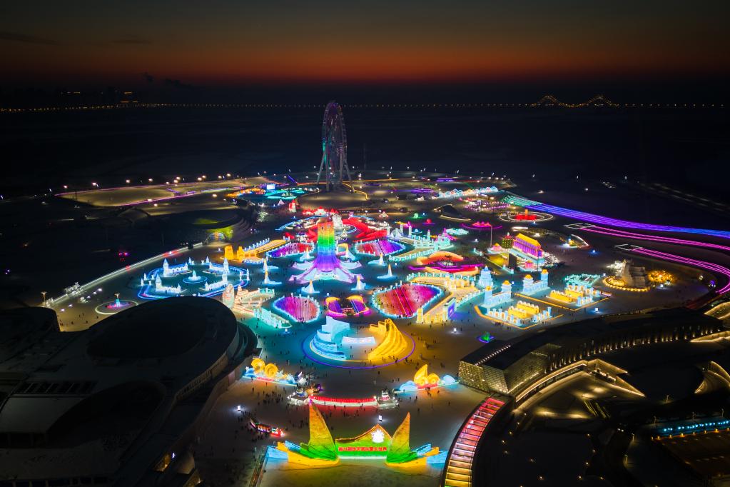 12月31日,游客在哈爾濱冰雪大世界園區游覽(無人機照片)。