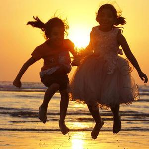 2022年12月31日,孩子們在巴基斯坦卡拉奇海邊的夕陽下玩耍。