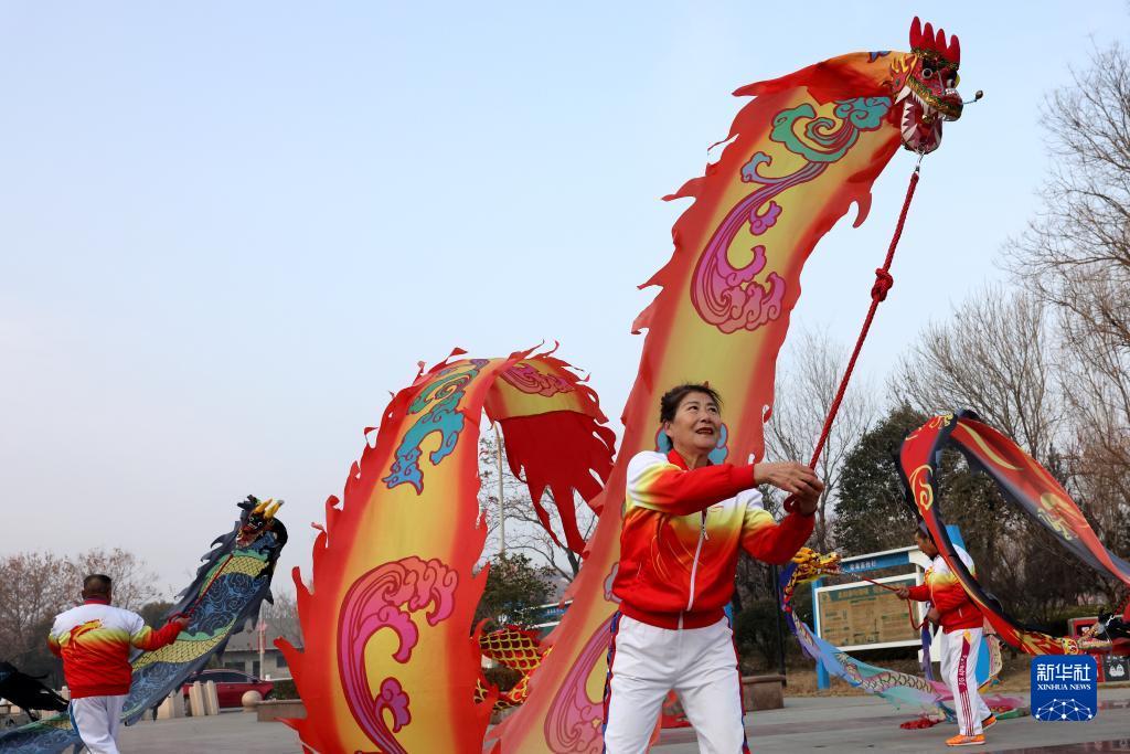 1月1日,在山東省棗莊市光明路街道西沙河公園,“彩帶龍”愛好者舞“彩龍”迎新年。