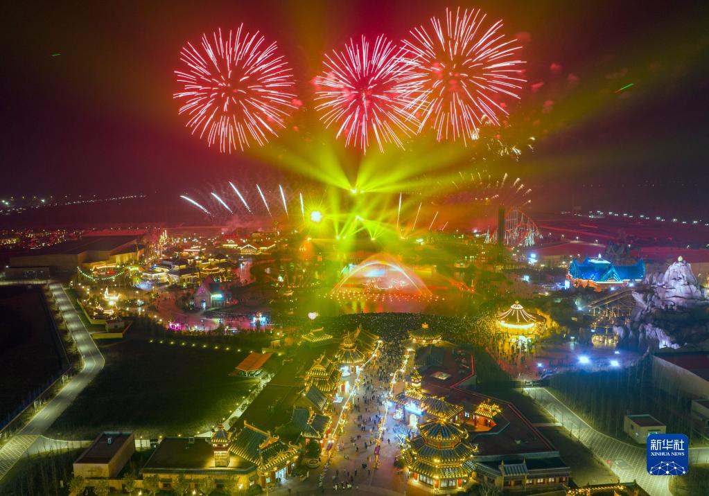 2022年12月31日,在江蘇省淮安市西游樂(lè)園,游客觀賞跨年煙花燈光秀(無(wú)人機(jī)照片)。