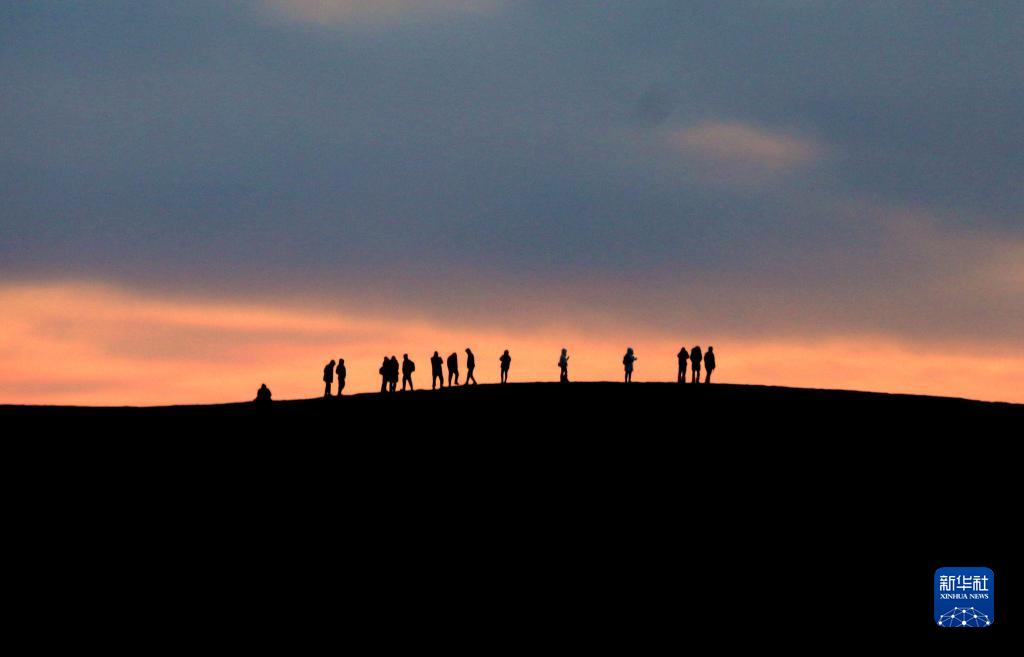 1月1日,游客在甘肅省敦煌市鳴沙山月牙泉景區觀賞大漠日出。