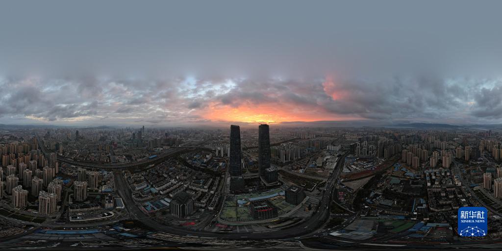 1月1日在云南省昆明市拍攝的日出(無人機全景照片)。