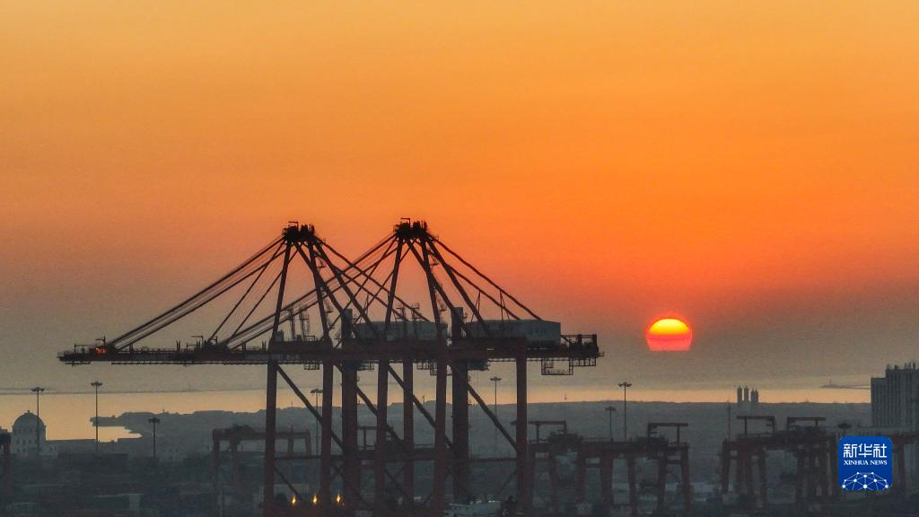 1月1日,晨光中的河北唐山港京唐港區碼頭(無人機照片)。