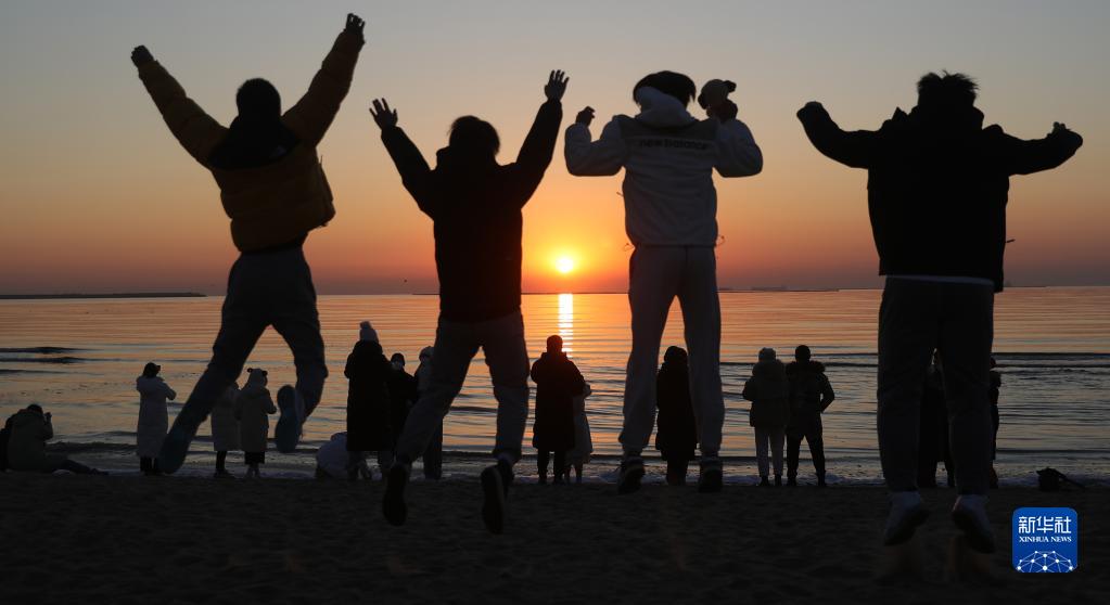 1月1日,在河北省秦皇島市海港區金夢海灣,市民與日出合影。