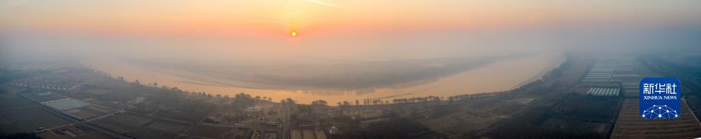 1月1日,在山東省濱州市濱城區市西街道黃河小街灣生態公園拍攝的日出(無人機全景照片)。