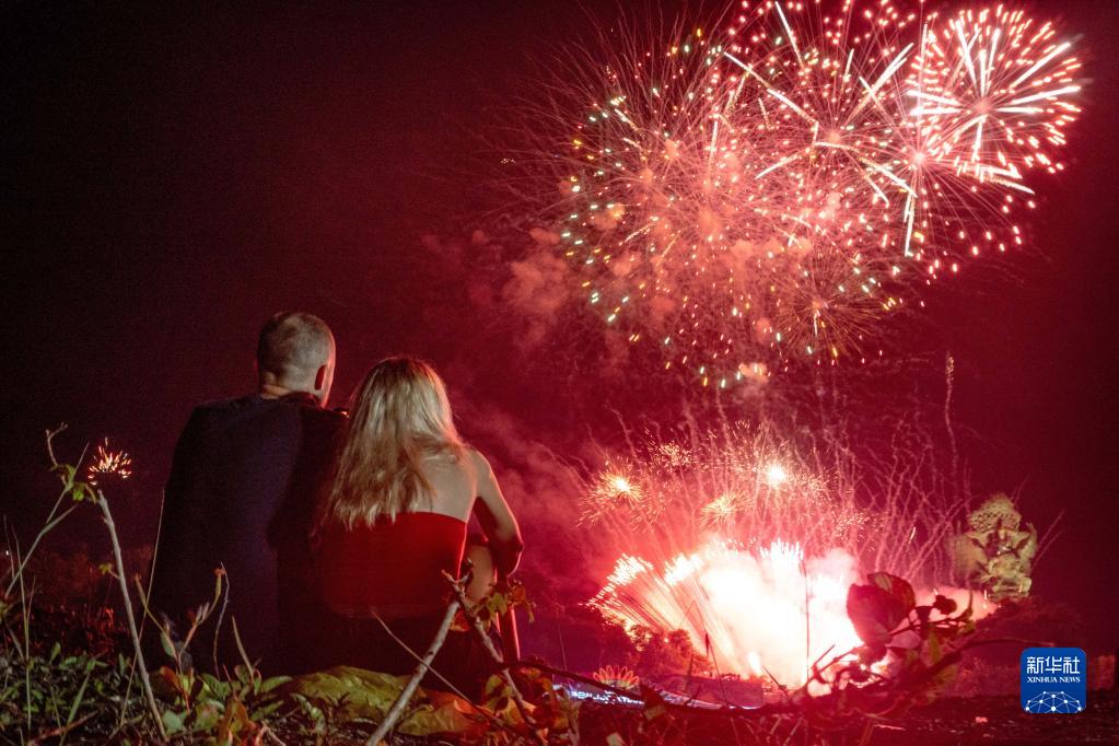 2022年12月31日,人們在印度尼西亞巴厘島觀看新年煙花。