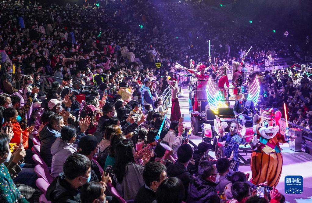 游客在廣州長隆旅游度假區游園看馬戲迎接新年(2022年12月31日攝)。
