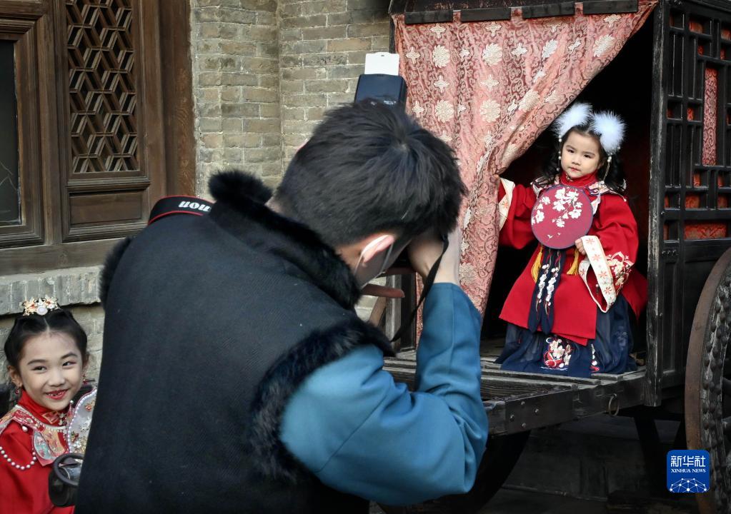 小朋友在位于鄭州市中牟縣的電影小鎮(zhèn)拍照(2022年12月31日攝)。