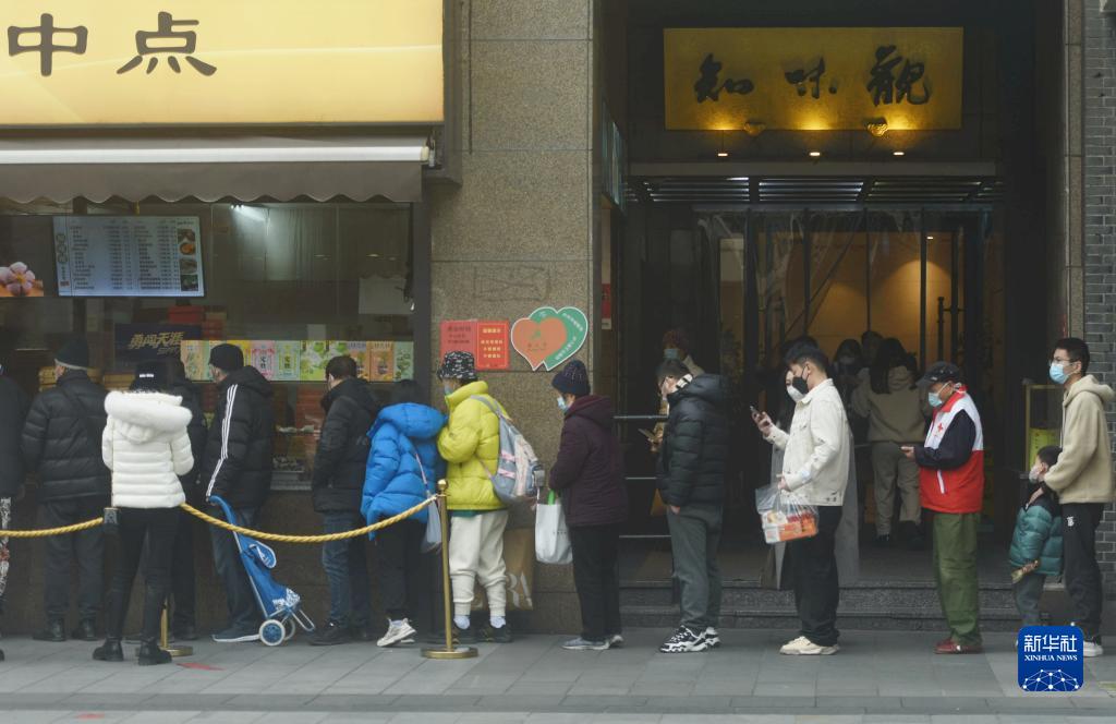 1月1日,顧客在杭州西湖邊的一家老字號餐館外排隊選購點心。