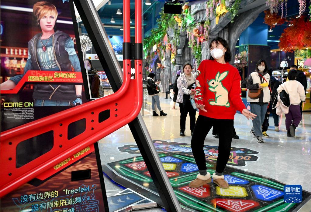 1月1日,一名市民在河北省邯鄲市一家商場玩跳舞機。