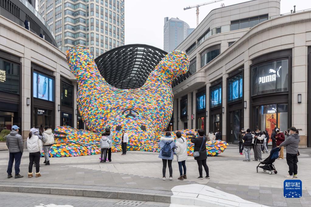 1月1日,市民在上海市靜安區南京西路興業太古匯門口的大型藝術裝置“五彩倒立兔”前拍照留影。