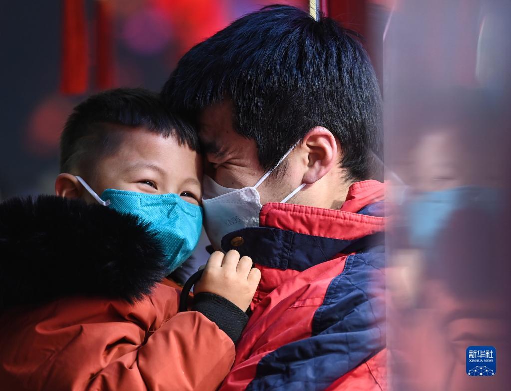 2022年12月31日,在大唐不夜城步行街,一對父子在購買棉花糖時親密互動。
