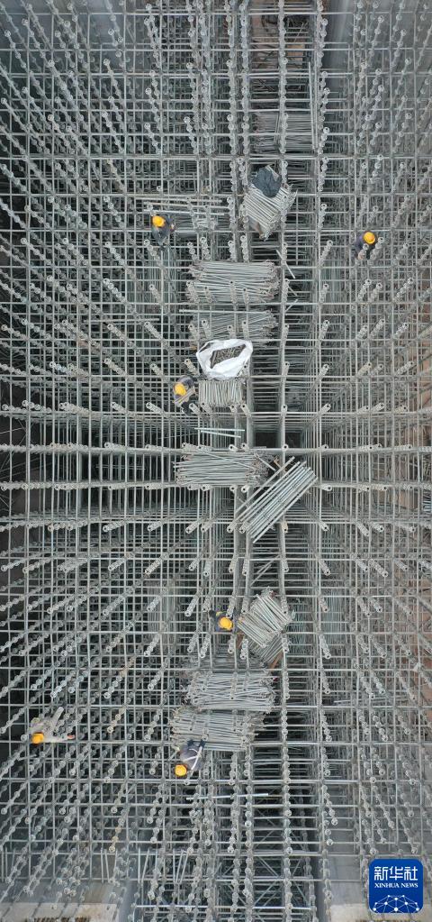 1月1日,浙江省臺州市杭溫鐵路仙居高架站項(xiàng)目現(xiàn)場,工人在加緊施工(無人機(jī)照片)。