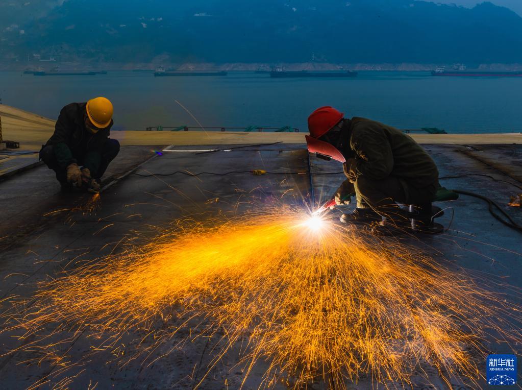 1月1日,湖北省宜昌市秭歸縣秭歸華星船務(wù)有限公司工人在船舶建造現(xiàn)場(chǎng)忙碌。