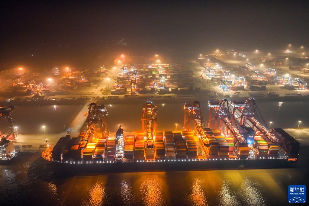 1月1日,集裝箱輪在寧波舟山港金塘港區大浦口集裝箱碼頭進行裝卸作業(無人機照片)。