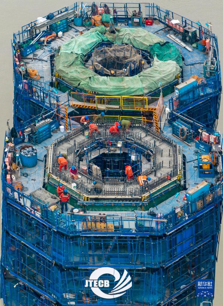 1月1日,中交二航局建設者在常泰長江大橋施工現場進行5號墩主塔中塔柱施工(無人機照片)。
