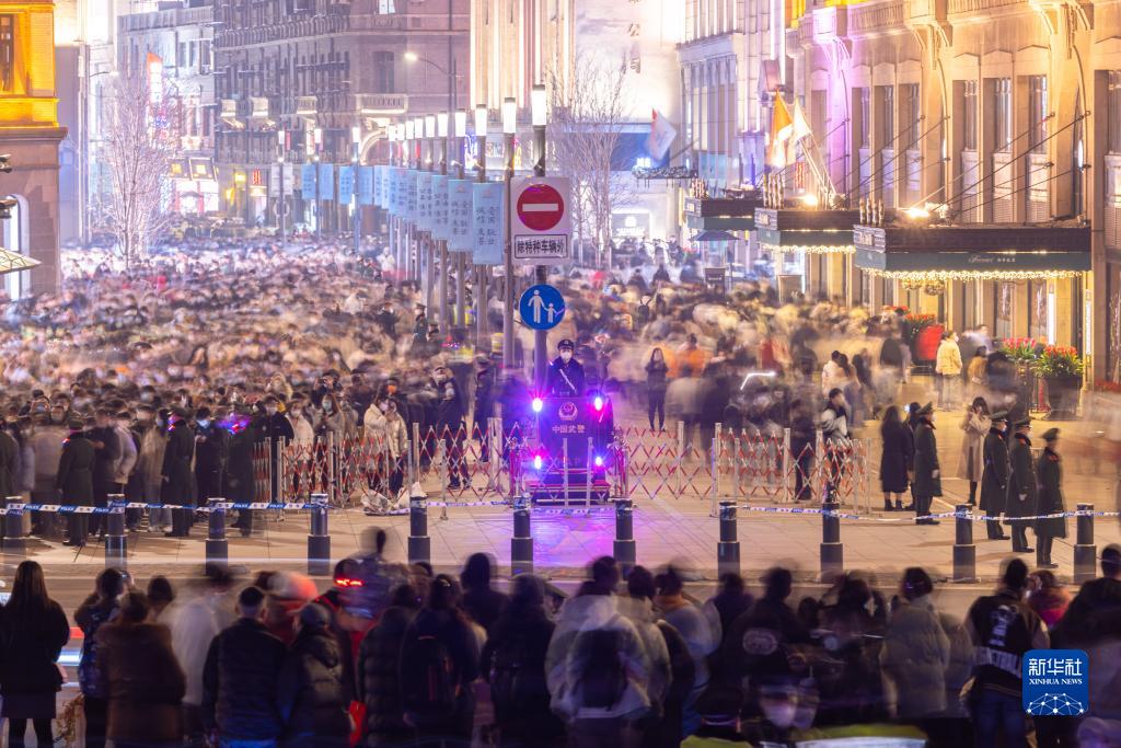 1月1日凌晨,武警上海總隊機動第一支隊官兵在南京東路路口以“環島”形式疏導人流。