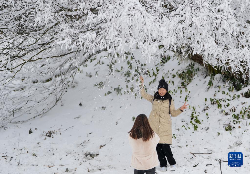 當日,位于重慶市南川區的世界自然遺產地金佛山迎來降雪。景區內雪花紛飛,銀裝素裹,南方罕有的冰雪景色吸引了眾多游客前往觀光旅游。據了解,當日金佛山景區接待游客達12000人,實現了新年冬季旅游的“開門紅”。