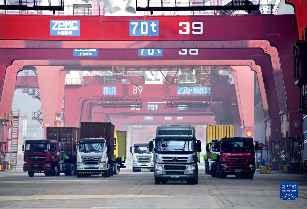 1月1日,青島港前灣QQCT集裝箱碼頭,貨車在運送集裝箱。