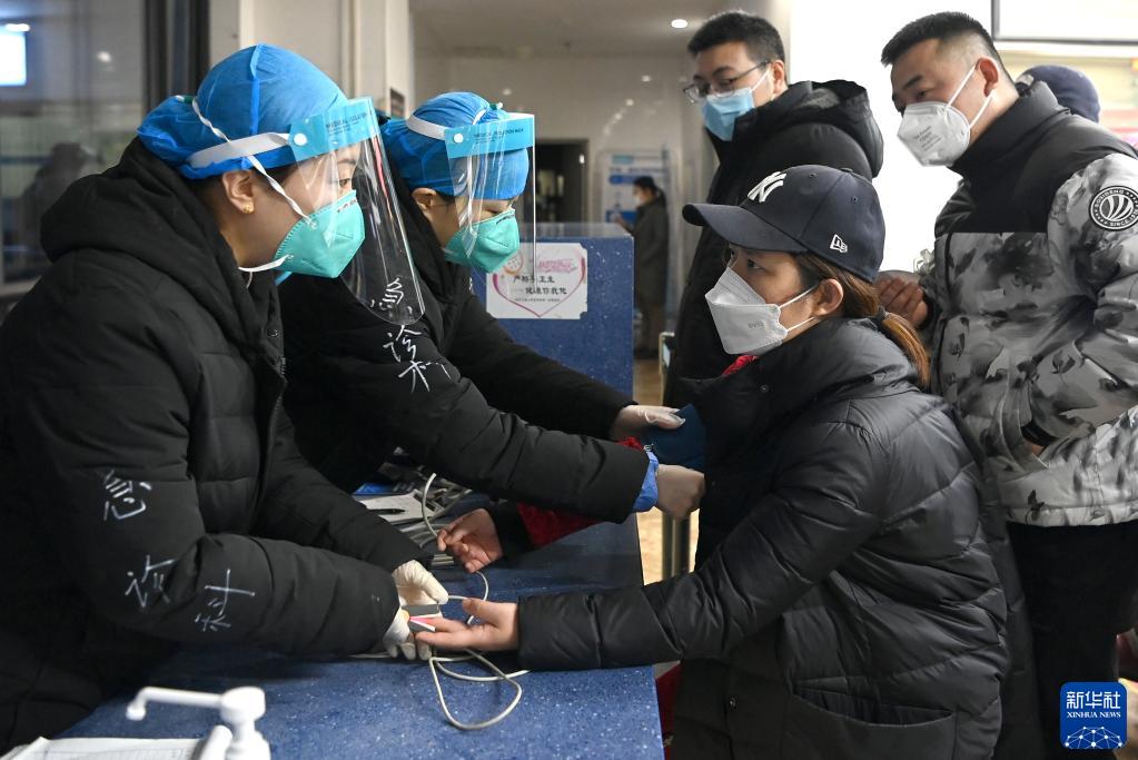 2022年12月31日,西安交通大學(xué)第一附屬醫(yī)院急診科分診臺的醫(yī)務(wù)人員為患者測量脈搏血氧飽和度。