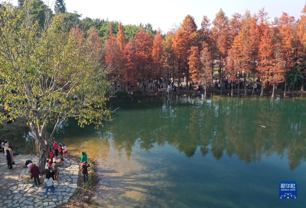 近日,廣西南寧青秀山風景區中的杉樹樹葉日益紅艷,吸引了眾多市民前來觀賞。
