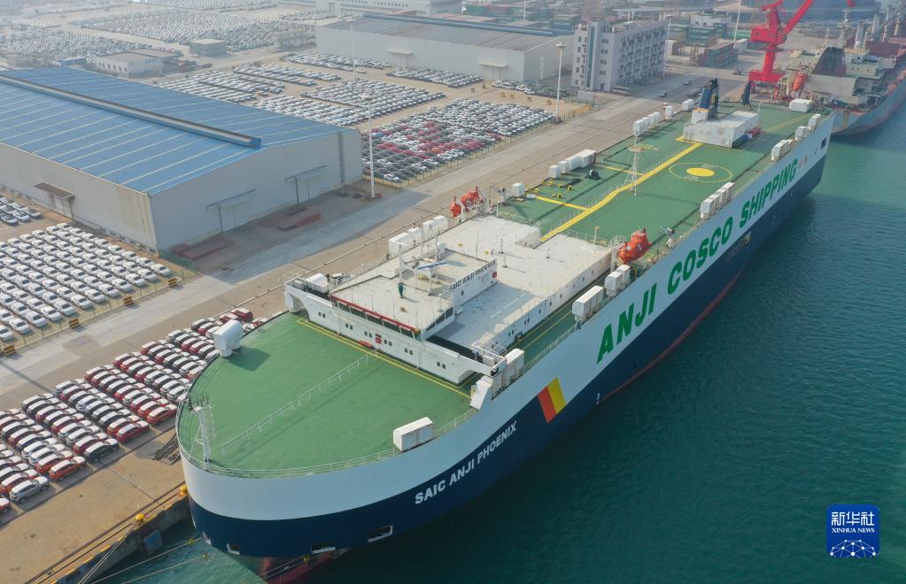 1月1日,大型汽車滾裝船“安吉鳳凰號”在江蘇連云港港汽車出口碼頭裝運車輛(無人機照片)。
