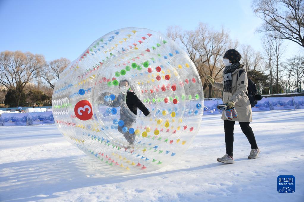 1月2日,一名小朋友在北京玉淵潭公園體驗(yàn)“雪地悠波球”。