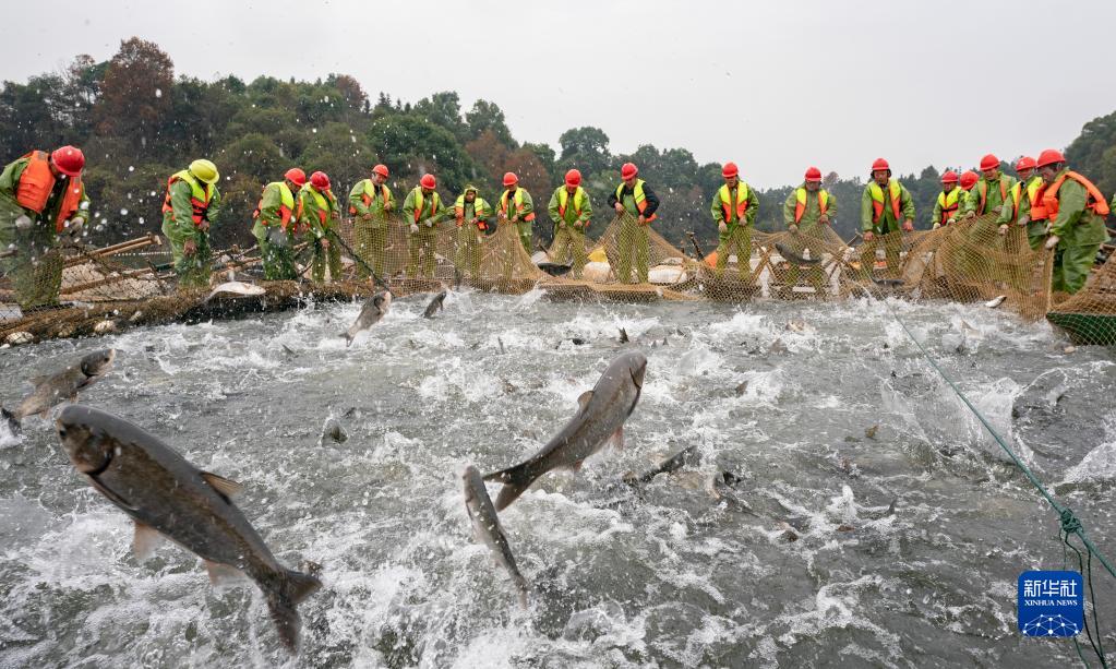 當日,漁民在江西省新余市仙女湖進行新年冬捕作業。仙女湖漁業資源豐富,盛產胖頭魚、鯉魚、青魚、鰱魚等魚類。