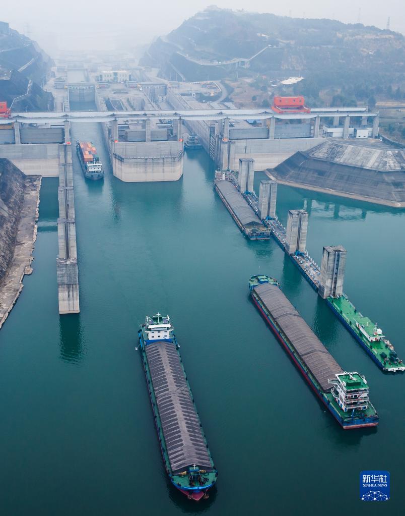 1月1日,船舶有序通過三峽雙線五級船閘(無人機照片)。