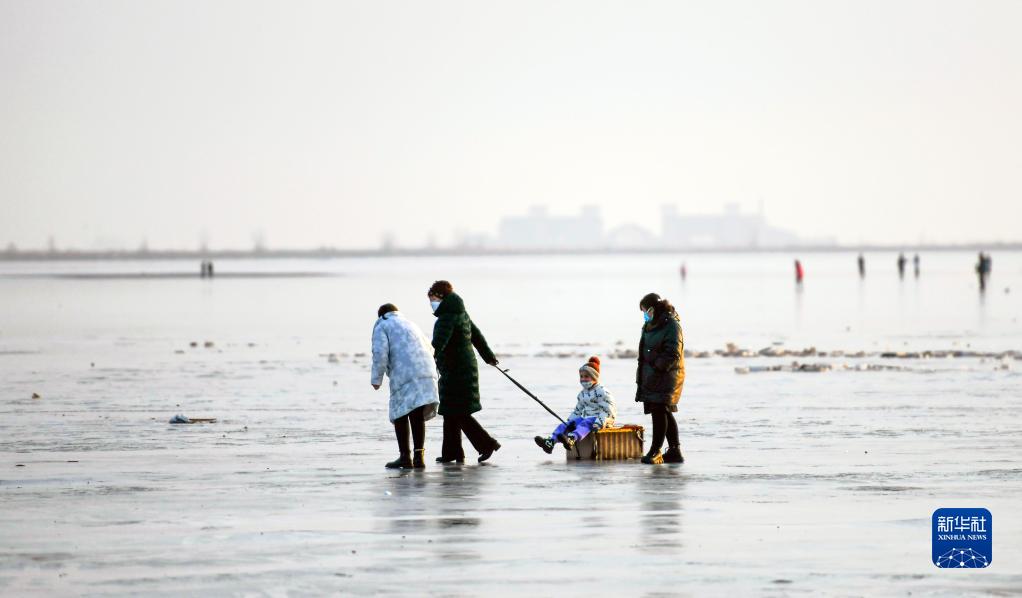1月2日,游客河北唐山海港經濟開發區海灘的冰面上游玩。
