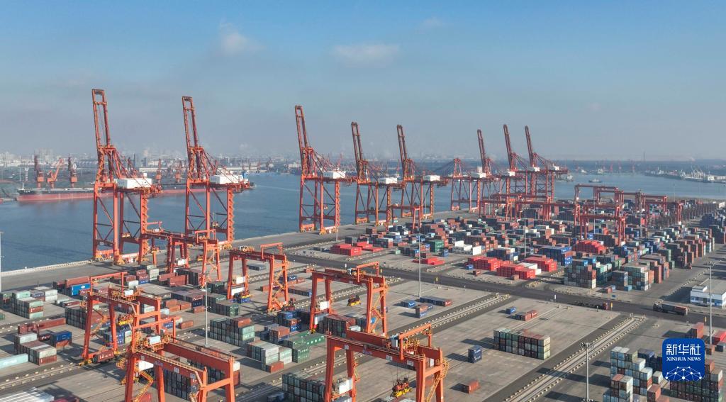 1月3日拍攝的河北唐山港京唐港區集裝箱碼頭(無人機照片)。